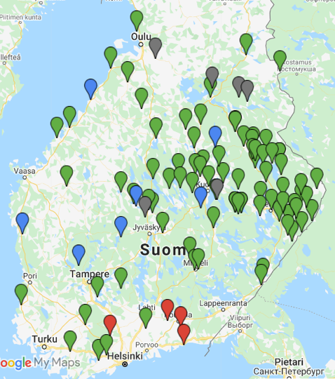 Nyt tämän viimeisimmän kuvausreissun jälkeen tilanne näyttää tältä (pohjoisen yksittäinen jo kuvattu tsasouna jää tämän karttakuvan ulkopuolelle):